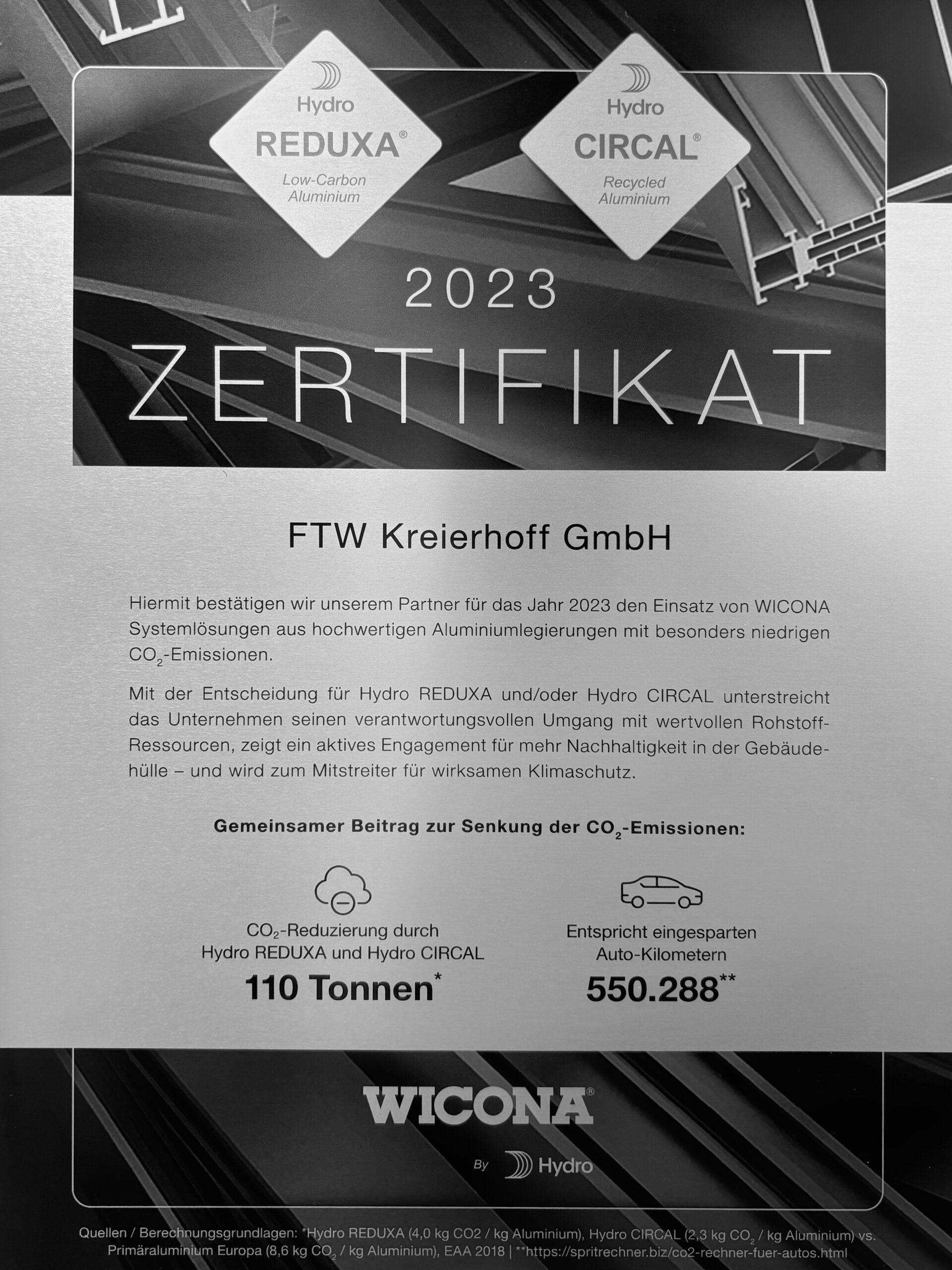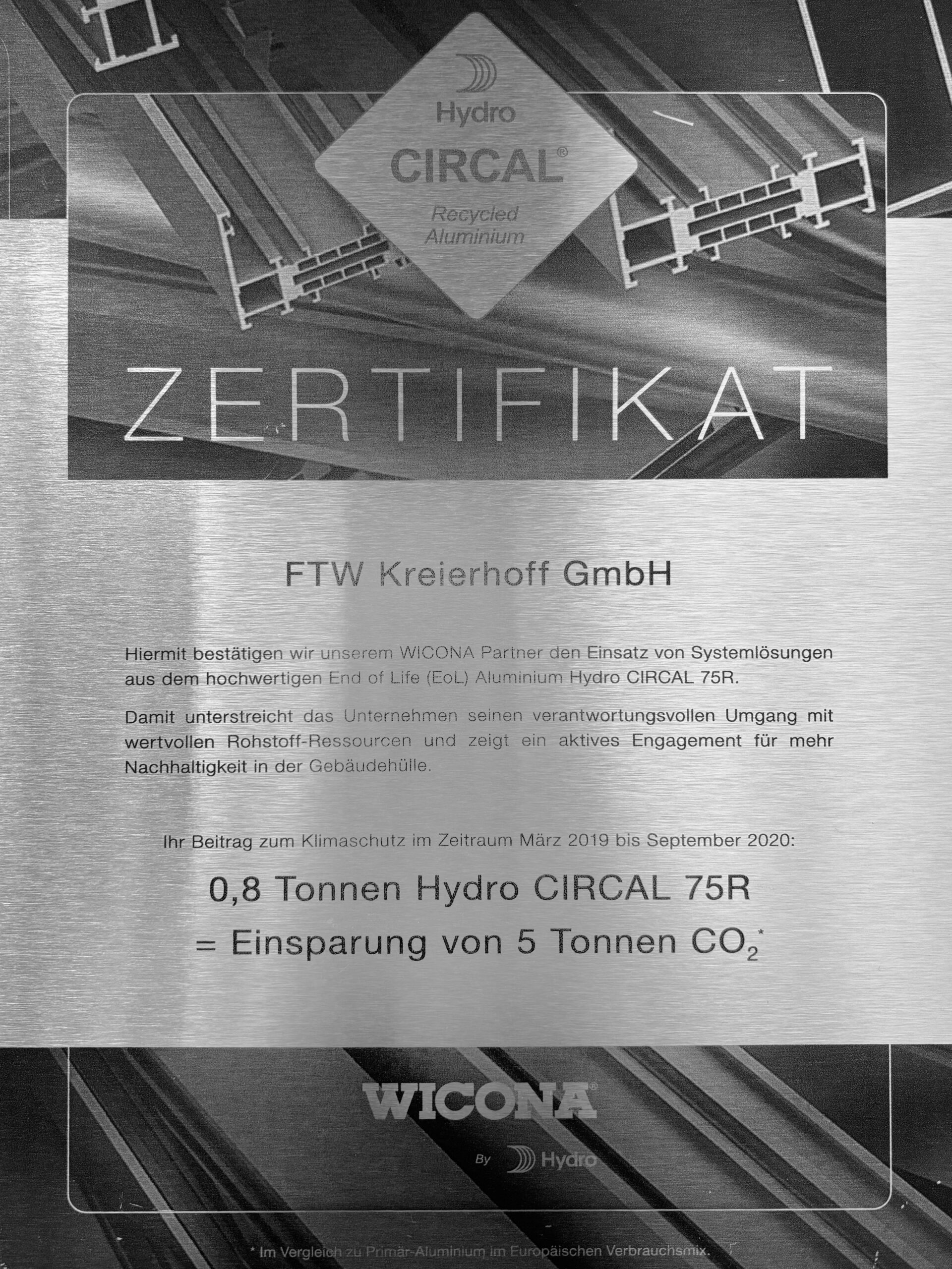 Hiermit bestätigen wir unserem WICONA Partner den Einsatz von Systemlösungen aus dem hochwertigen End of Life (EoL) Aluminium Hydro CIRCAL 75R.