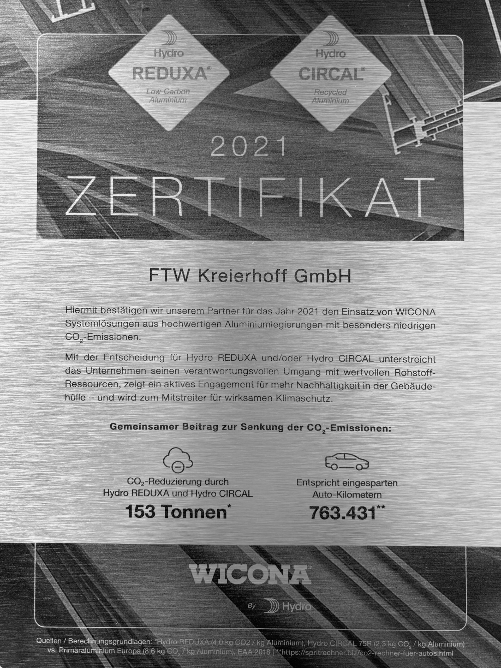 Hiermit bestätigen wir unserem Partner für das Jahr 2021 den Einsatz von WICONA Systemlösungen aus hochwertigen Aluminiumlegierungen mit besonders niedrigen CO₂-Emissionen.