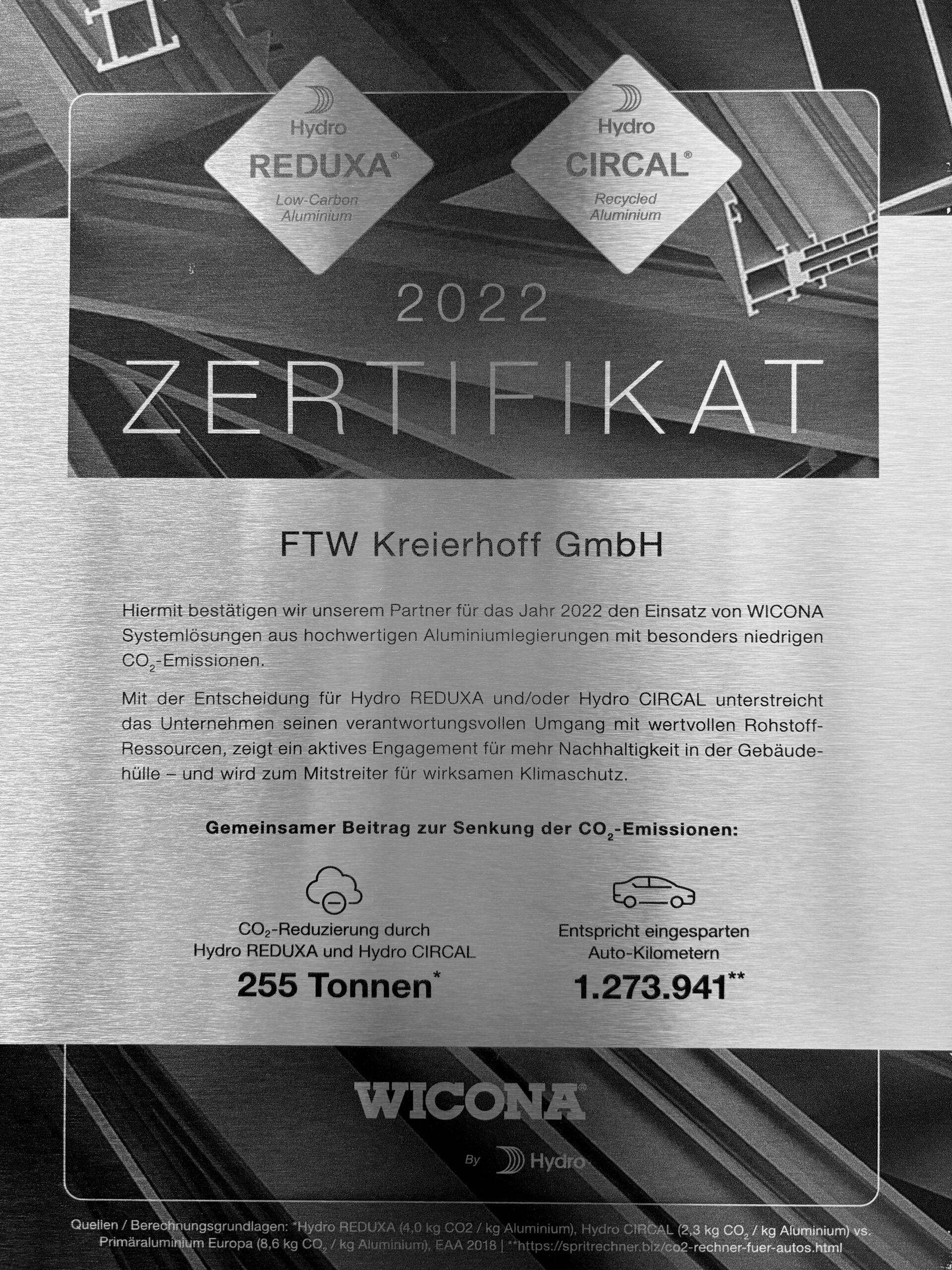 Hiermit bestätigen wir unserem Partner für das Jahr 2022 den Einsatz von WICONA Systemlösungen aus hochwertigen Aluminiumlegierungen mit besonders niedrigen CO₂-Emissionen.